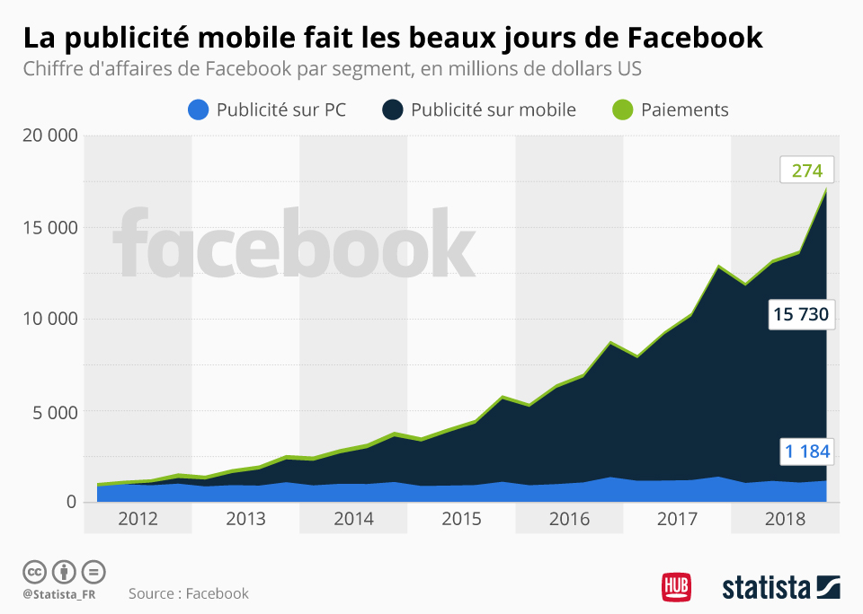 D’après une étude Statista, le réseau social enregistre une hausse de 30 % de son chiffre d'affaires en 2018 par rapport à la même période fin 2017, pour atteindre environ 17 milliards de dollars. Le bénéfice de Facebook, qui atteint près de 7 milliards de dollars, a bondi de 61% en un an. Cette croissance globale est fortement tributaire d’un segment précis: la publicité sur mobile, dont les revenus se sont élevés à 15,7 milliards de dollars au dernier trimestre. Commencée en 2012, cette activité a porté ses fruits puisqu’elle représente plus de 90% de son bénéfice, contrairement au chiffre d’affaires lié à la publicité sur desktop qui stagne depuis 6 ans.