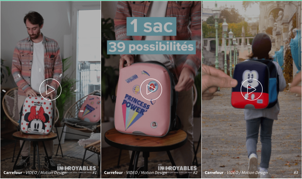 Concrètement, lorsque l'on fait la promotion d'un produit ou d'un service, notre approche va être de dégager une "little idea" pour chaque plateforme, tout en maîtrisant les coûts de production grâce à des talents agiles, des techniques créatives peu coûteuses, ou des shootings mutualisés. Anticiper les idées créatives permet ainsi de créer une seule campagne qui va s’exprimer différemment en fonction des touchpoints. C’est ce que nous avons fait pour Carrefour, qui a lancé un sac à dos, à destination des enfants, possédant une coque personnalisable et interchangeable. Nous avons créé une campagne unique, mais avec des assets créatifs différents selon les plateformes (packshots, démo produit, témoignages…) de manière à avoir un résultat le plus adapté possible aux codes de ces dernières.
